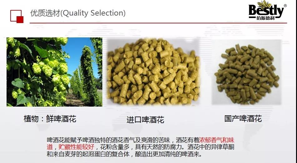 第二種原料是啤酒花,啤酒花其實是一種植物,分為進(jìn)口啤酒花和國產(chǎn)啤酒花。進(jìn)口啤酒花一般在新西蘭、美國、德國三個國家進(jìn)行采購,國產(chǎn)啤酒花從甘肅和新疆進(jìn)行選擇。
