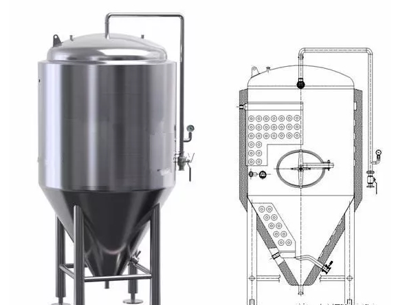 (1)底部為錐形便于生產(chǎn)過程中隨時排放酵母,要求采用凝聚性酵母。圓錐底的夾角一般為60o~80o,也有90o~110o,但這多用于大容量的發(fā)酵罐。發(fā)酵罐的圓錐底高度與夾角有關,夾角越小錐底部分越高。一般罐的錐底高度占總高度的1/4左右,不要超過1/3。圓錐底的外壁應設冷卻層,以冷卻錐底沉淀的酵母。錐底還應安裝進排污口、出酒口、溫度傳感、制冷夾套等。罐的直徑與高度比通常為1:2~1:4,不能太高,以免引起強烈對流,影響酵母和凝固物的沉降
